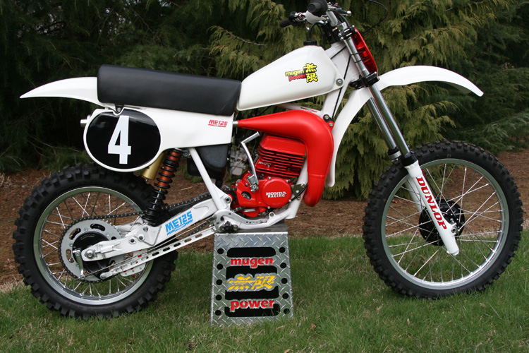 It was less than a year and the bike was sitting in my shop. I wanted to build this bike in honor of Johnny O'Mara's 30 year anniversary of the first Mugen ride he had. I actually built this bike a couple of years ago. I started from the ground up. bearings not that it needed them, brake shoes, 8 gage stainless spokes and nipples, new wheels, powerdercoated hubs, new Dunlops, tubes, rim locks, nos airfilter, cables, new plastic, seat cover, hand made chain guide and buffer, brake pedal is a Mugen pedal.