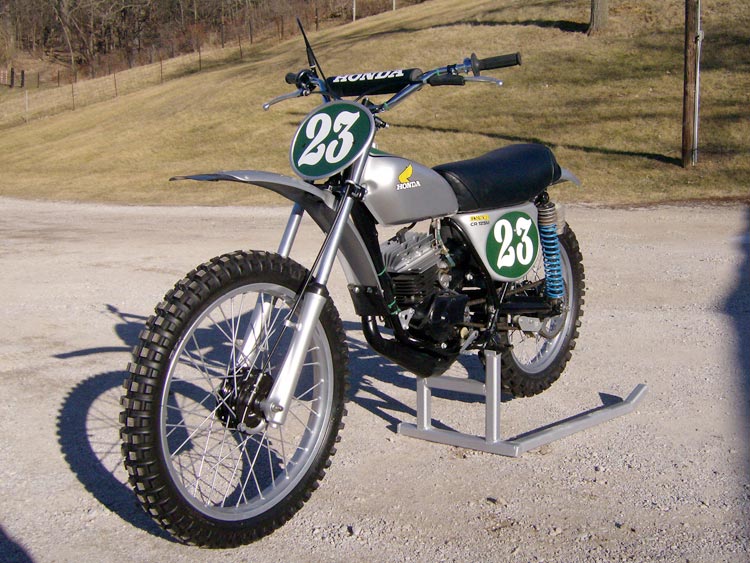 After 18 years of talking about restoring it I jumped head first into the project in February of 2006. Ten months later this is what turned out. It was a fun and frustrating project all in one. Dick Smith was the owner of the CR during the summers of '75 and '76. I was racing an XR75 early that summer when he asked me if I wanted to race it. Man, that was cool when you're only 15 years old. We ran the local tracks around eastern Iowa. Tipton Hills Raceway (aka Wild Country), Otter Creek Motorsports. There were a lot of trophies won with that bike.