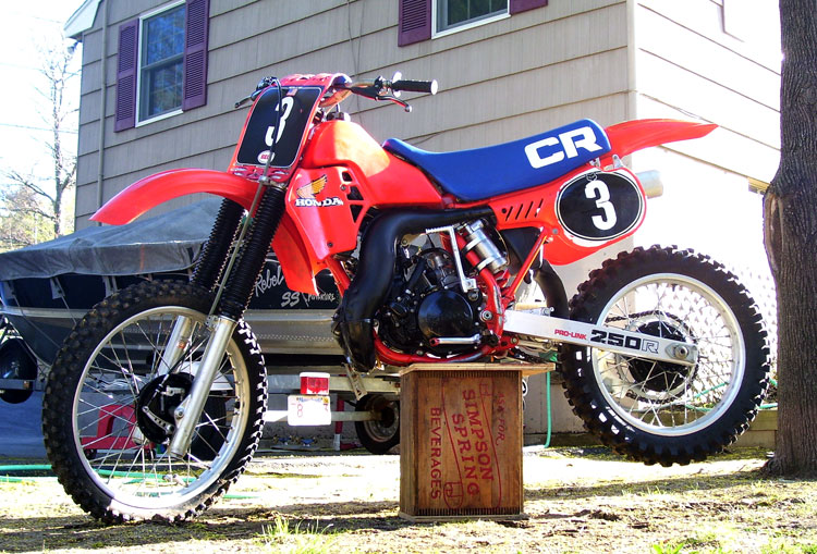 Except for the back tire, left side case, and front number plate, it is the original bike I purchased in 1983, right down to the levers, handle bars, grips and stickers! I got the left side case from this web site from some guy in MO. for $20. I don't remember his name but I cant thank him enough since he got the ball rolling to put the bike back together.The tire and plate were also from 1983. What you see is what I raced then, I was going to paint it completly but came to realize I would be covering up many old memories.