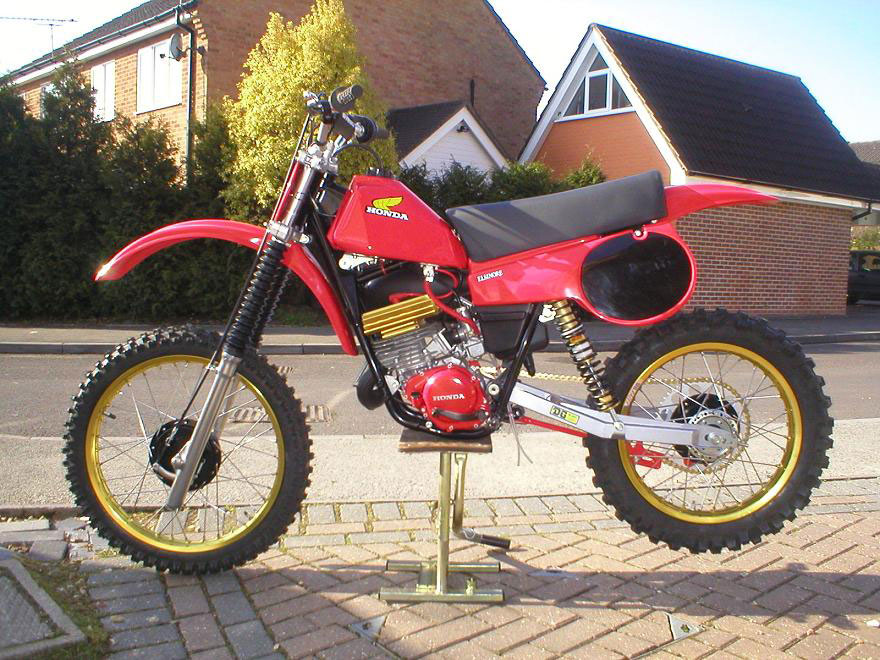 This is my 1980 Honda Elsinore CR125R. A friend of mine made The tank for me. If anyone wants one I can get some more made. The rims are Barrani rims not Excell. I went for something different. The seat cover was an ebay item, and the swingarm came from the USA, not sure what it is. A friend of mine said it may be a Kelvin Franks arm. I also have a set of billet yokes to fit, maybe Franks also. All engine work I do myself so I know it is right. I like to do my own. Then I can only blame myself of it goes wrong. The rear shocks came from Falcon shocks in the UK, that is where I live. They were new, frame was blasted and powder coated at Powder Pot in Blandford UK, plating was done at Ferndown Finshing in Dorset. I recon it took me around 80 or so hours, on and off. You have got to push yourself to get on with it or you just dont get it done, hence another unfinshed project.