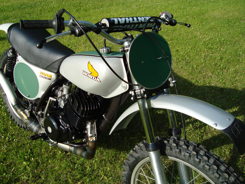The only parts the bike was missing was the original pipe and back fender. I got a pipe from Vintage Iron and a fender from dc plastics. I used the original tank as a template and painted the MT250 tank to match, turned out beautifully! Has original keihin carb, had trouble with inlet needle, adapted one from a newer CR, had to machine seat down to get it to fit, works perfect now.