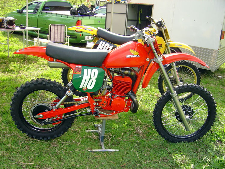 I had Ohlins shocks on back when the smaller pictures were taken, but have just rebuilt a set of Fox Shox for it and have also just found an OEM front guard (fender) to fit! I have also fitted a pair of 41mm '81 CR250R forks to it. These can be seen in the main picture.